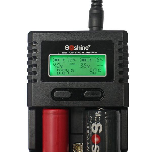 Двухканальное зарядное устройство SOSHINE SC-H2 (V.2)* предназначено для заряда следующих типов АКБ: Ni-Mh, Ni-Cd, LiFePO4 и Li-ion. Зарядное устройство оснащено ЖК-экраном, на котором наглядно отображается процесс заряда аккумулятора отдельно по каждому из каналов. Зарядное устройство автоматически прекратит заряд по достижении аккумулятором максимальной емкости. Тип установленных аккумуляторов распознается автоматически, устройство заряжает следующие АКБ:
